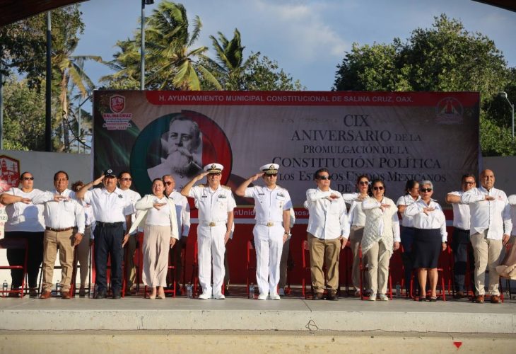 El presidente municipal de Salina Cruz, Daniel Méndez Sosa, estuvo presente en el acto protocolario organizado a través de la Regiduría de Educación, Deporte y Fomento Turístico, con motivo del CIX aniversario de la promulgación de la Constitución Política de los Estados Unidos Mexicanos de 1917, mediante una ceremonia cívica. En el evento, el edil estuvo acompañado de autoridades civiles y militares, regidores del Ayuntamiento, así como directivos de diversas instituciones educativas. Participaron la Escuela Secundaria Técnica No. 51 y la Escuela Primaria Vespertina “Constitución de 1917”, siendo esta última la encargada de presentar una poesía coral. Asimismo, se contó con la intervención de la Banda de Música de la Décima Región Naval, que contribuyó al realce de esta significativa conmemoración.