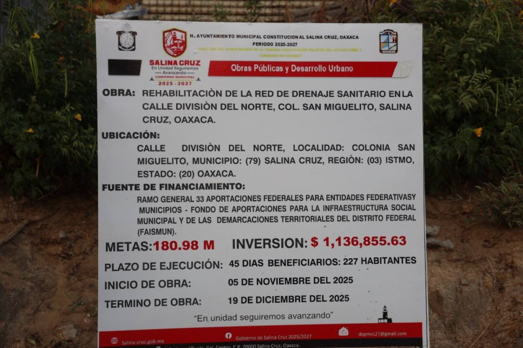 El Gobierno Municipal de Salina Cruz, encabezado por el presidente Daniel Méndez Sosa, continúa atendiendo las necesidades básicas de la población con la inauguración de la obra de rehabilitación del drenaje sanitario en la colonia San Miguelito.