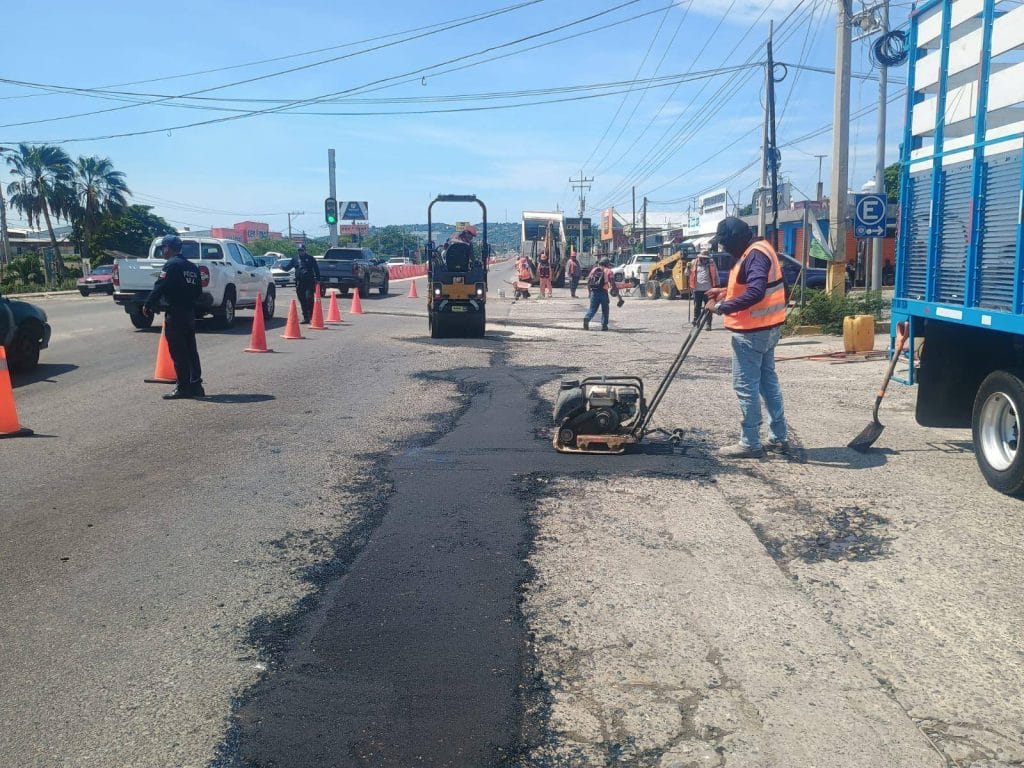Asimismo, se efectuaron trabajos de bacheo desde la entrada de la Unidad Deportiva hasta la Costera, por instrucciones del presidente municipal, Daniel Méndez Sosa.
