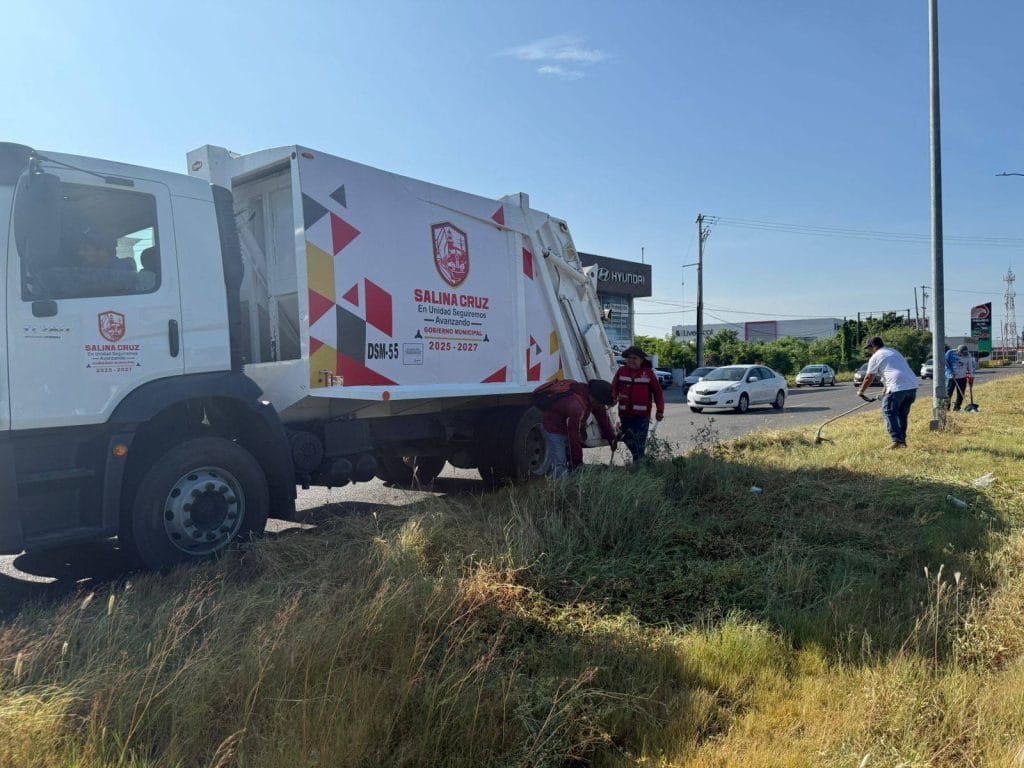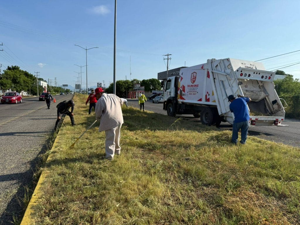 Con la finalidad de mejorar la imagen urbana de Salina Cruz, desde tempranas horas se realizaron labores de limpieza y bacheo sobre la carretera Transístmica, en el tramo comprendido desde el arco de seguridad hasta la plaza Pabellón.